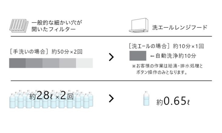 一般的なフィルターに比べて、お掃除時間が2か月で約90分短縮約55リットルの節水を実現!
