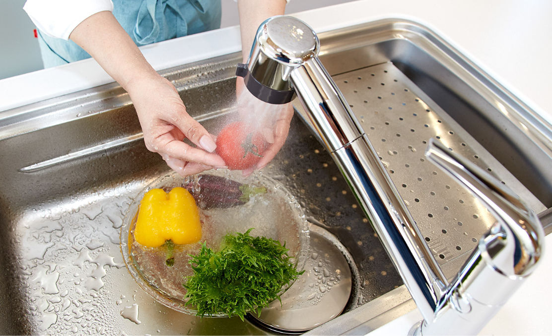 汚れが良く落ちて手がしっとり潤ってお料理にもおすすめのウルトラファインバブル水しかもシャワーホース引出しタイプなので、シンクをお掃除する時や大きなお鍋を洗う時にもとっても便利なんです♪