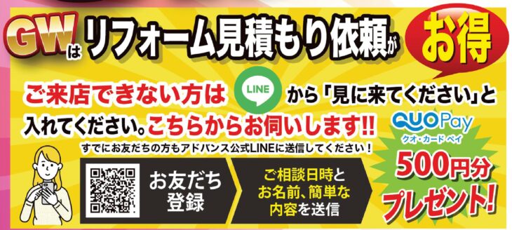 HOMEイベント情報今治店今治店 GWリフォーム大相談会 今治店 GWリフォーム大相談会 開催日時 4月25日(土)~5月24日(日) (会場:アドバンスリフド今治店) 詳しくはこちら > GW リフォーム大相談会! in今治店 \GWは特典いろいろ/ ★見積り特典★ Quoカードペイ500円分プレゼント! ★ご成約特典★ 「選べるギフト」プレゼント!(期間中にご成約の方) ★キッチンリフォーム特典★ LIXIL ES シンプルプランをお選びの方 人大カウンターグレードUP! ★お風呂リフォーム特典★ ※昨今の中東情勢により商品の供給が不安定になっております。ご了承ください。 LIXIL リデアC シンプルプランをお選びの方 浴室暖房換気扇グレードUP! 補助金 でお得にリフォーム! スタッフまでお気軽にお問い合わせください プランニング・ご相談・お見積り 無料です! 会場 アドバンスリフド今治店 会場住所 愛媛県今治市喜田村2丁目2-20 開催日時 4月25日(土)~5月24日(日) 参加費 無料 一言 「LINEでお見積り」でクオカードペイプレゼント! 備考 補助金活用でお得にリフォームできるチャンス! アクセスマップを確認する 今治店一覧はこちら チラシ情報一覧はこちら イベント情報一覧はこちら アドバンス・リフドについて 選ばれる理由 会社案内代表挨拶会社概要経営理念店舗紹介 キッチン 浴室 洗面 トイレ リフォームメニュー一覧 キッチン 浴室 洗面 トイレ 施工事例 施工事例一覧 全面 玄関 LDK キッチン 浴室 洗面室 トイレ 洋室・和室 窓 屋根・外壁 屋根 外壁 外構・エクステリア お客様の声 お客様の声一覧 イベント情報 イベント情報一覧 全店合同 新居浜店 松山店 今治店 四国中央店 チラシ情報 お役立ち情報 中古×リノベ 耐震と断熱 リフォームの流れ よくあるご質問 アドバンスのWEBチラシ お困りごと解決サービス 補助金を使ってお得に窓リフォーム! 住宅省エネ2026キャンペーン 先進的窓リノベ2026事業 みらいエコ住宅2026事業 給湯省エネ2026事業 ブログ ブログ記事一覧 快眠リフォーム ペットと暮らす幸せリフォーム 商品紹介 施工ブログ 補助金 Youtube イベント情報 施工事例 新居浜店 四国中央店 今治店 松山店 その他 お問い合わせ お問い合わせ お見積もり 資料請求 来店予約 こちらからも情報発信中! 会社案内代表挨拶会社概要経営理念店舗紹介 施工事例一覧 お客様の声一覧 コラム一覧 イベント一覧 ブログ一覧 価格表一覧 選ばれる理由 中古×リノベ耐震と断熱リフォームの流れよくあるご質問アドバンスのWEBチラシお困りごと解決サービス補助金を使ってお得に窓リフォーム!住宅省エネ2026キャンペーン先進的窓リノベ2026事業みらいエコ住宅2026事業給湯省エネ2026事業 お問い合わせお見積もり資料請求来店予約 © 2019 株式会社アドバンス