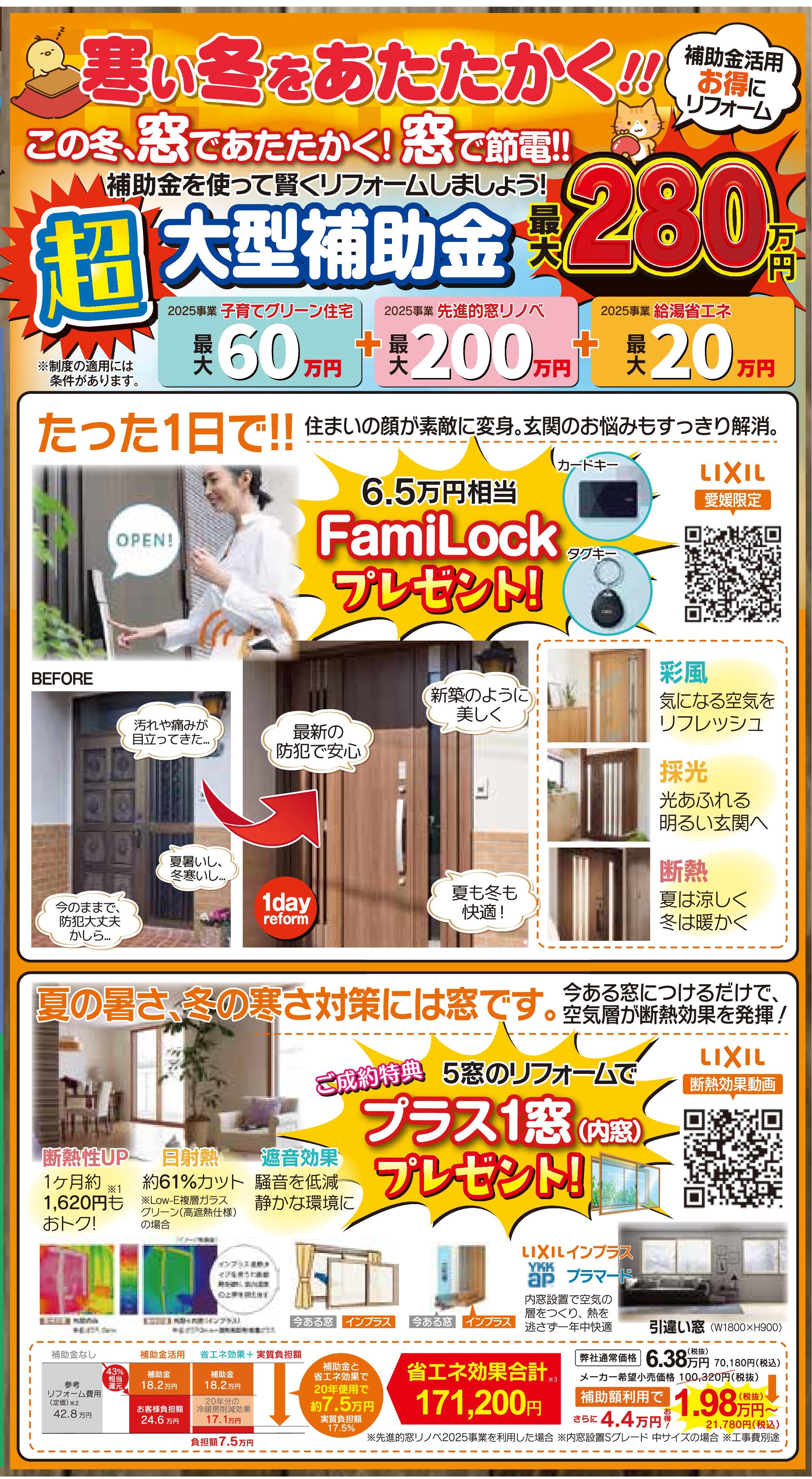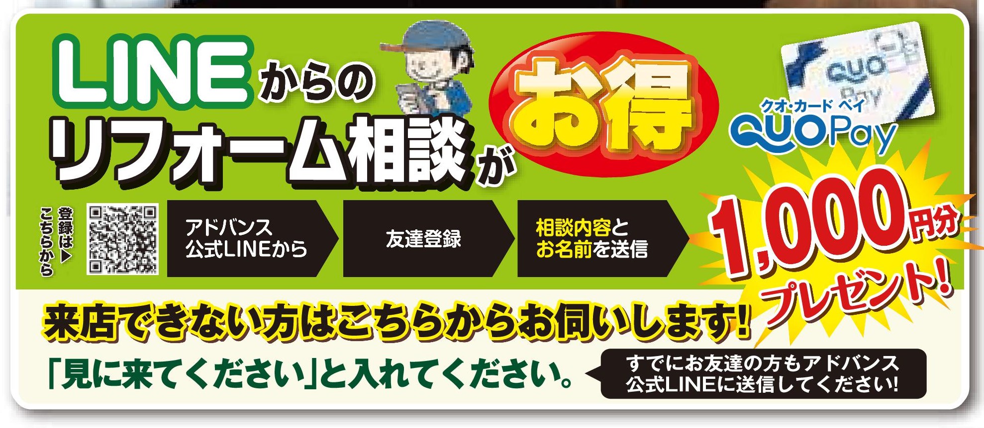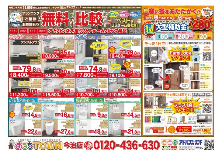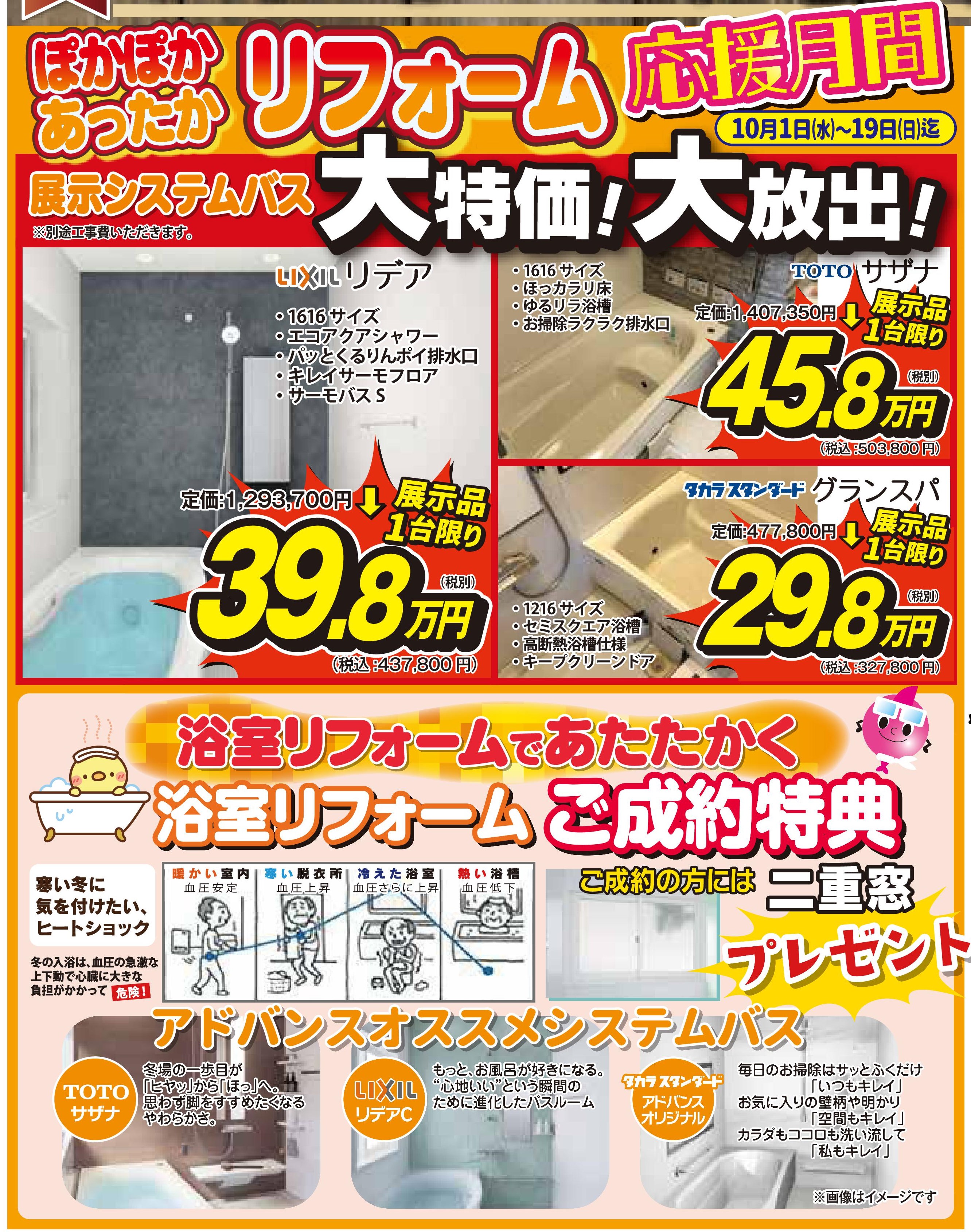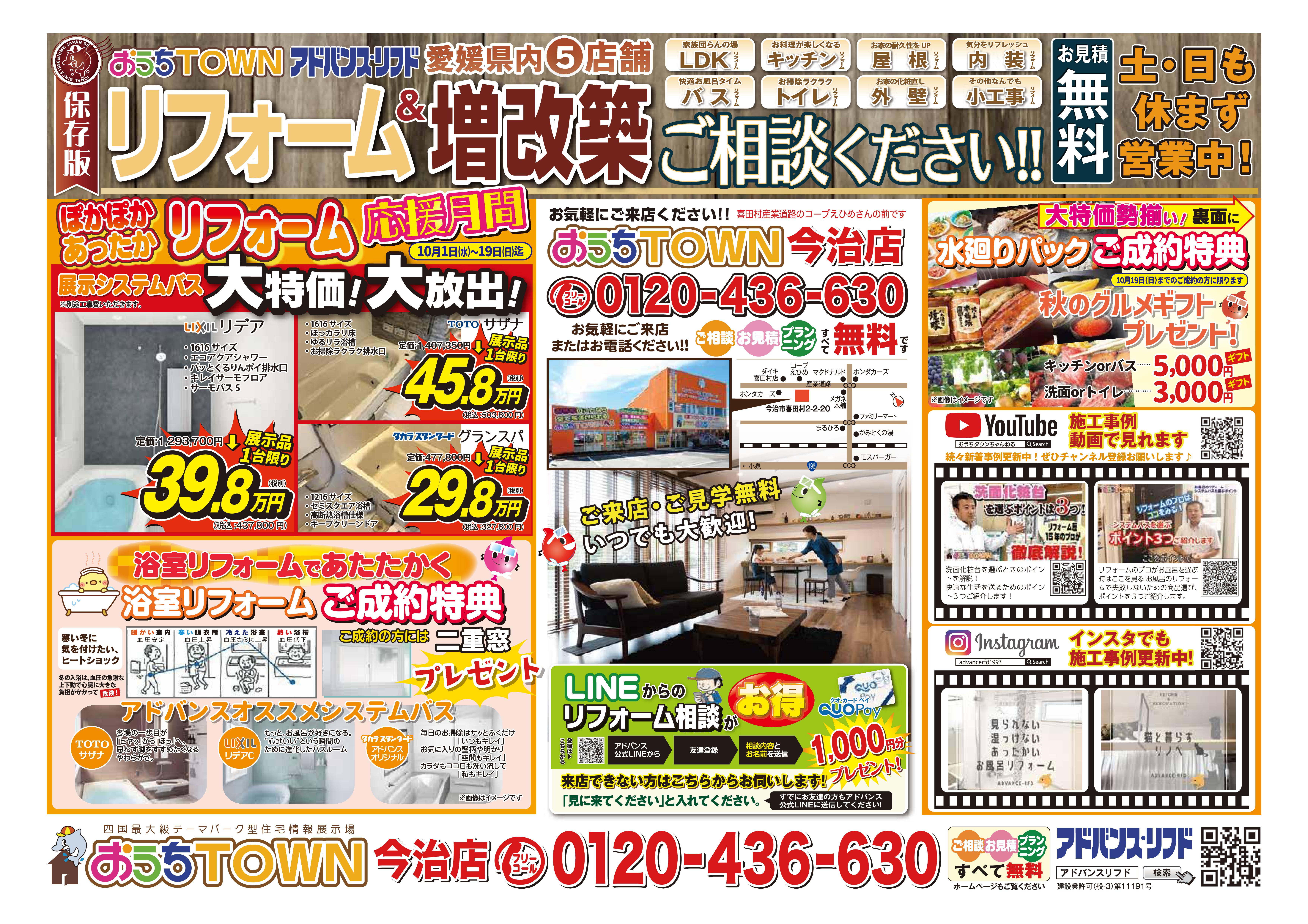 HOMEイベント情報今治店今治店ぽかぽかリフォーム応援月間! 今治店ぽかぽかリフォーム応援月間!(終了しました) 開催日時 土日も相談受付中!(会場:アドバンスリフド今治店) 詳しくはこちら > ぽかぽかあったか リフォーム応援月間! in今治店 \ご成約特典/ ★浴室リフォームご成約のお客様★ 二重窓プレゼント! (10/1~19までにご成約の方) ★水廻りパックご成約のお客様★ 「秋のグルメギフト」プレゼント! (10/19までにご成約の方) 冬支度は 補助金 + 特典 で お部屋もお財布もぽっかぽか 来店できない方はこちらからお伺いします! プランニング・ご相談・お見積り 無料です! 会場 アドバンスリフド今治店 会場住所 愛媛県今治市喜田村2丁目2-20 開催日時 土日も相談受付中! 一言 10/1~19までウレシイ特典あります♪ 備考 浴室・水廻りリフォーム成約特典も見逃せない! アクセスマップを確認する 今治店一覧はこちら チラシ情報一覧はこちら イベント情報一覧はこちら アドバンス・リフドについて 選ばれる理由 会社案内代表挨拶会社概要経営理念店舗紹介 キッチン 浴室 洗面 トイレ リフォームメニュー一覧 キッチン 浴室 洗面 トイレ 施工事例 施工事例一覧 全面 玄関 LDK キッチン 浴室 洗面室 トイレ 洋室・和室 窓 屋根・外壁 屋根 外壁 外構・エクステリア お客様の声 お客様の声一覧 イベント情報 イベント情報一覧 全店合同 新居浜店 松山店 今治店 四国中央店 チラシ情報 お役立ち情報 中古×リノベ 耐震と断熱 リフォームの流れ よくあるご質問 アドバンスのWEBチラシ お困りごと解決サービス 補助金を使ってお得に窓リフォーム! 住宅省エネ2026キャンペーン 先進的窓リノベ2026事業 みらいエコ住宅2026事業 給湯省エネ2026事業 ブログ ブログ記事一覧 快眠リフォーム ペットと暮らす幸せリフォーム 商品紹介 施工ブログ 補助金 Youtube イベント情報 施工事例 新居浜店 四国中央店 今治店 松山店 その他 お問い合わせ お問い合わせ お見積もり 資料請求 来店予約 こちらからも情報発信中! 会社案内代表挨拶会社概要経営理念店舗紹介 施工事例一覧 お客様の声一覧 コラム一覧 イベント一覧 ブログ一覧 価格表一覧 選ばれる理由 中古×リノベ耐震と断熱リフォームの流れよくあるご質問アドバンスのWEBチラシお困りごと解決サービス補助金を使ってお得に窓リフォーム!住宅省エネ2026キャンペーン先進的窓リノベ2026事業みらいエコ住宅2026事業給湯省エネ2026事業 お問い合わせお見積もり資料請求来店予約 © 2019 株式会社アドバンス