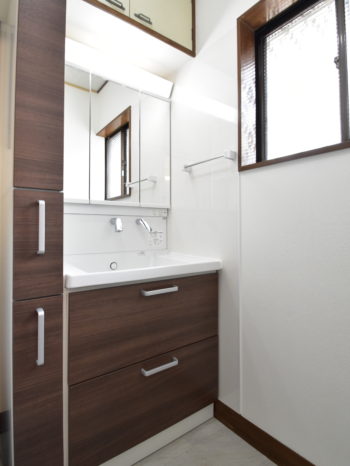 サイドキャビネットや可動棚で収納量を増やした洗面所。
