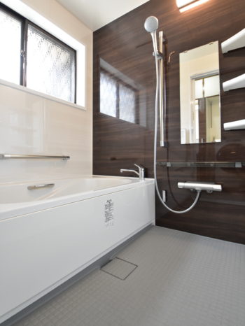 ウォールナット調のアクセントパネルがきれいです。洗い場のカウンターは コンパクトなものにして、広く使えるようにしました。