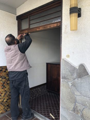 建具屋さんが新しい玄関を取り付けます。