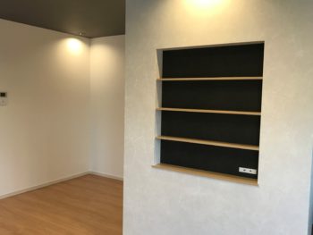 飾り棚の背面には天井と同じ色のクロスを貼りました。季節の小物や思い出の写真を飾ることができます。