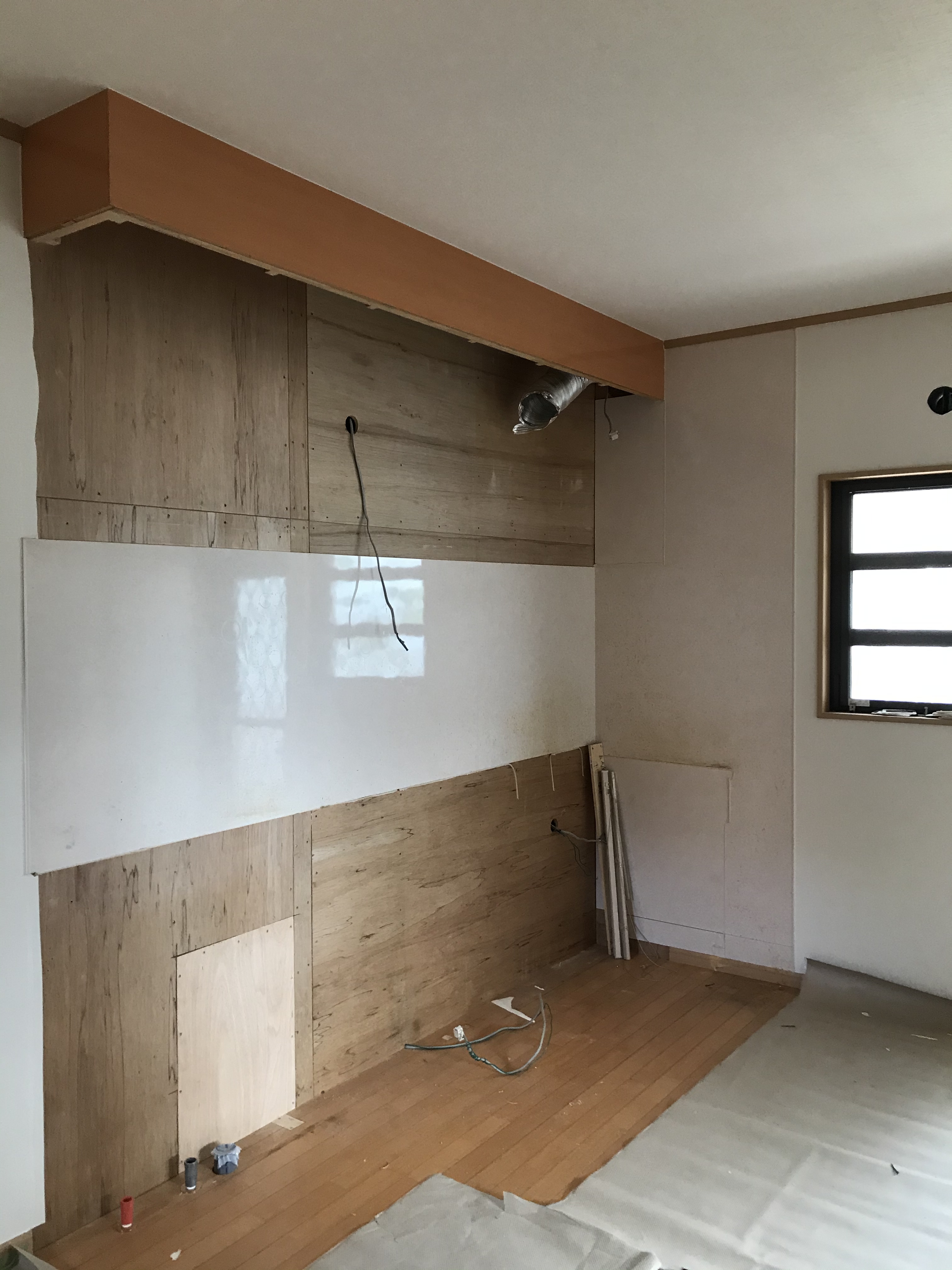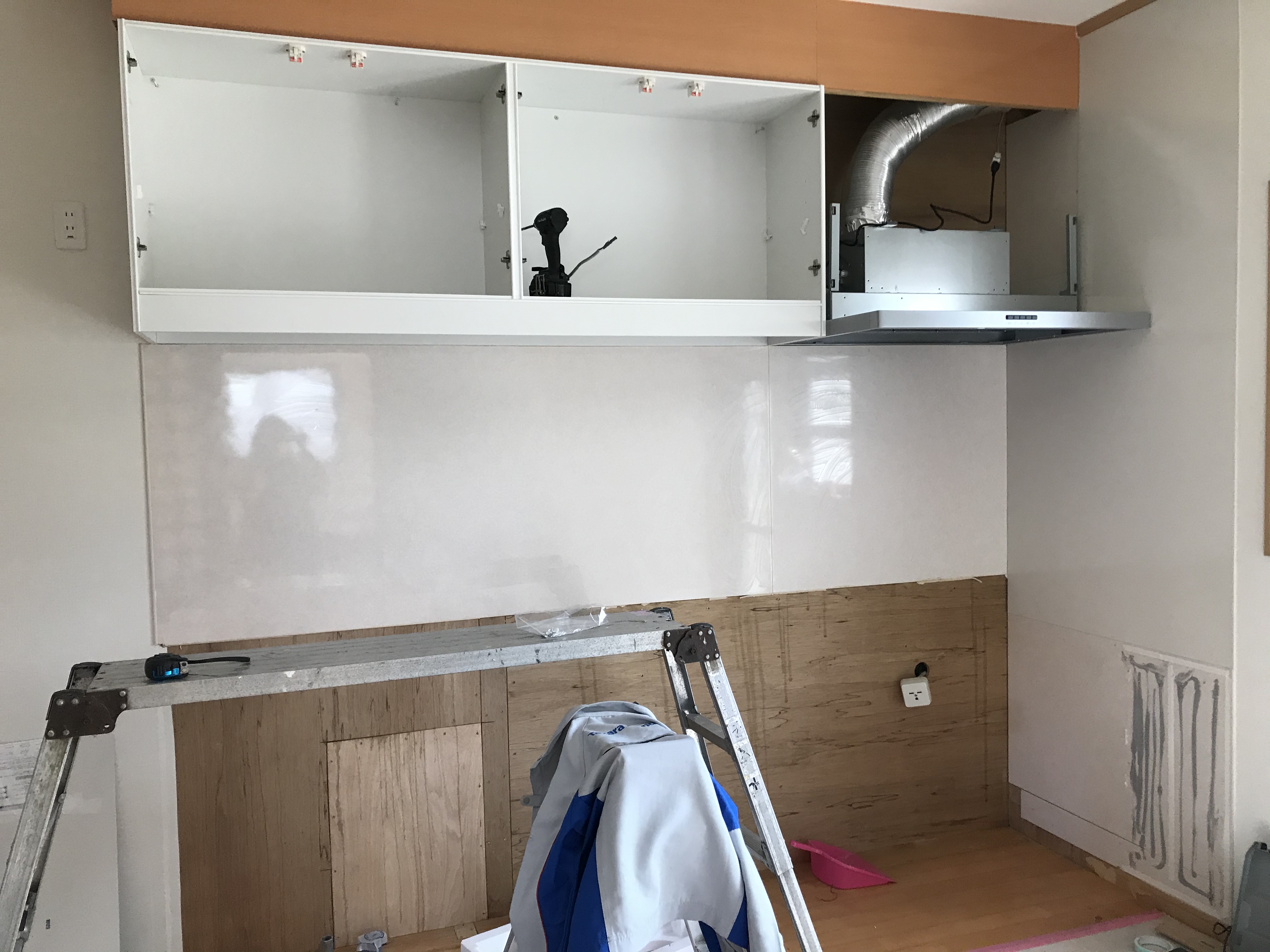 元々のキッチンパネルの上に新しいホーローパネルを施工してきます。