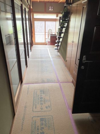 職人さんが資材を搬入する為に使用する廊下は傷がつかないようにきちんと養生します。