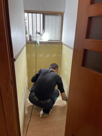 トイレのクロス施工中。
