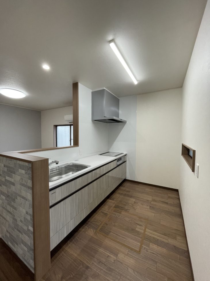 今回はコンロ前の壁の幅を1m40cm、キッチン手元の腰壁の高さを1m15cmにしました。通常よりもコンロ前の壁が広く、腰壁の高さが高い理由は、廊下からキッチンへ入ってきたときにキッチン部分があまり見えないようにするためです。