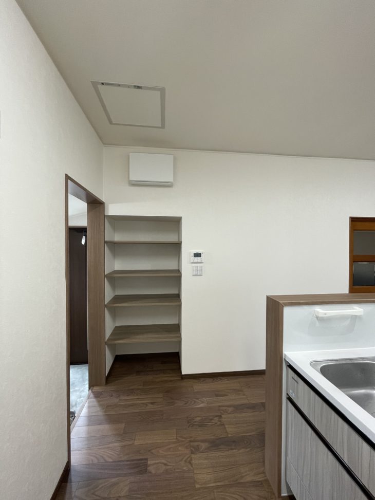 元々勝手口だったので入口横には下駄箱が設置されていました。下駄箱は全て撤去して、オープンの可動棚収納にしました。サッとしまえて、サッと取り出しやすい収納棚として活用できます。