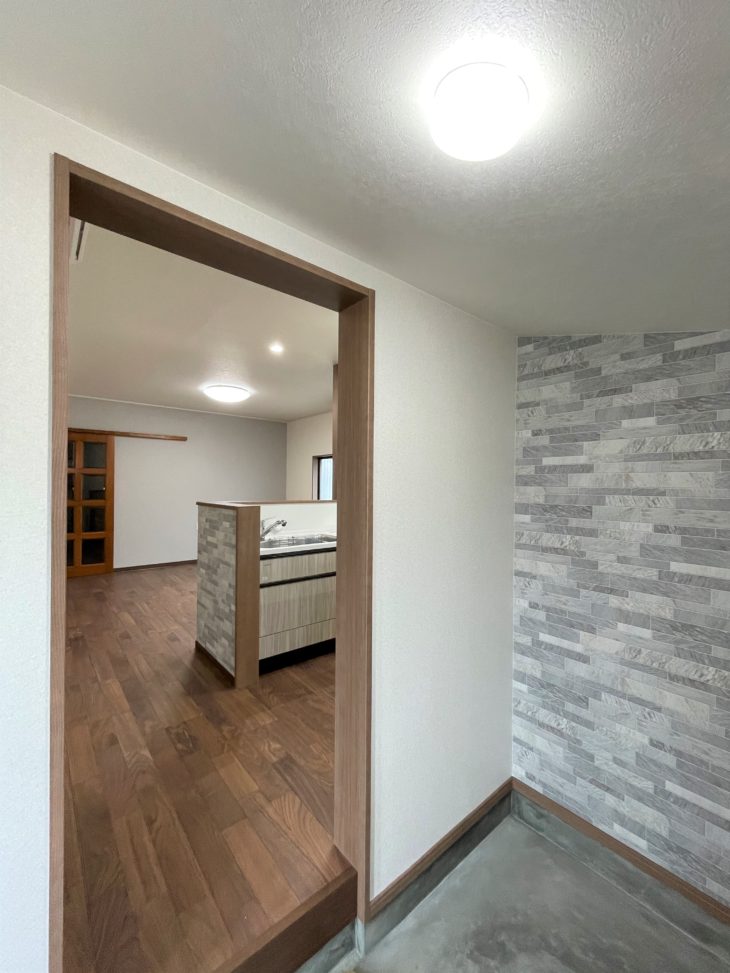 キッチン腰壁と勝手口土間のアクセントクロスを同じにして、空間に統一感を持たせました。