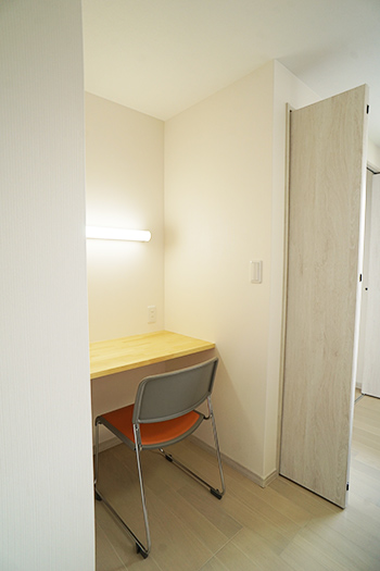 各部屋に作り付けのデスクを造作しました。2階は建具もホワイトを選び、清潔感のあるスッキリとした空間に仕上がりました。
