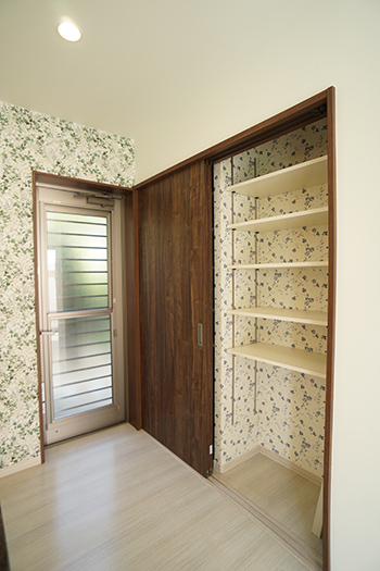 キッチンの横には大容量のパントリーを造作。買い置きのモノや食器類も入れることができます。ここにも奥様のお気に入りのクロスを貼りました。