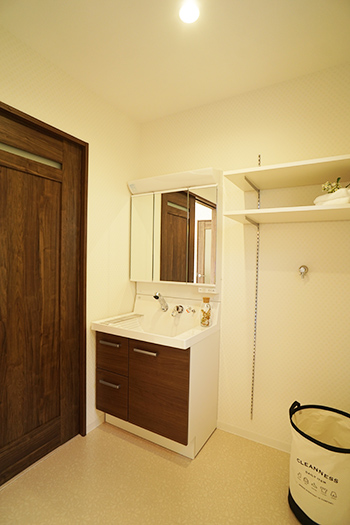 建具の色に合わせた洗面台を取り付けました。洗濯機上にも可動棚を付けることで、洗濯洗剤や細々したものを片付けることができます。