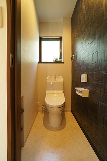 1階トイレはご主人様が選んでくれたブラックのアクセントクロスを貼りました。白黒はっきりしたかっこいい空間です。