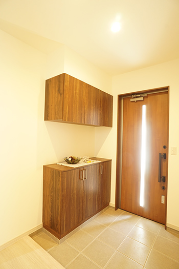 明るく落ち着きのある玄関。玄関収納も新設して、散らかりがちな靴をスッキリ片付けることができます。