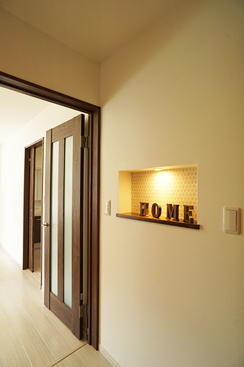 玄関ホールにはニッチを造作しました。写真を飾ったり、季節の小物を飾ったり、楽しみ方はたくさんあります。