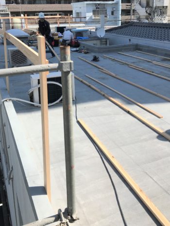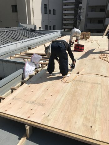 屋根へ材料を吊り上げる作業中。有料駐車場内の為、朝一での作業を行いました。