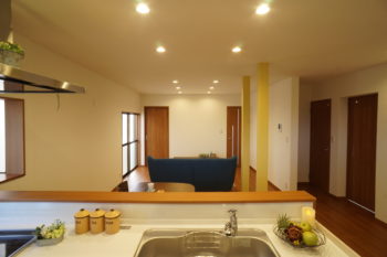 IH前の壁もないのでLDKを広く感じられます。また照明も全てダウンライトで見た目もスッキリ。
