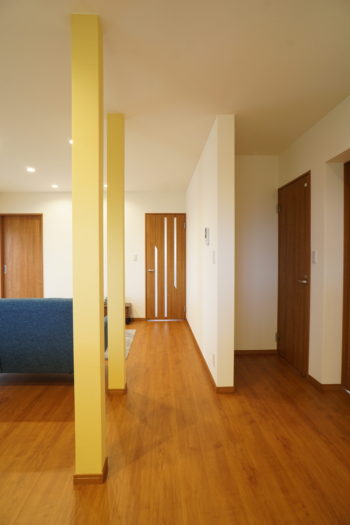 構造上抜けない柱にはイエローのアクセントクロスを貼りました。
