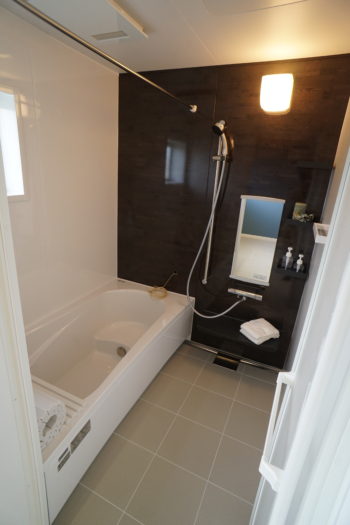 ダークブラウンを基調としたシックで高級感のある浴室。
