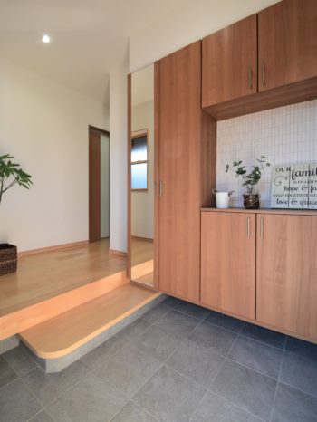 大容量の玄関収納で、玄関がスッキリします。式台を設置して、段差も緩和しています。