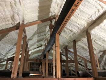 屋根裏に吹き付けの断熱を施工しています。床も同様に吹き付けの断熱を行います。