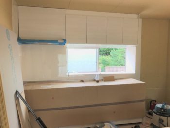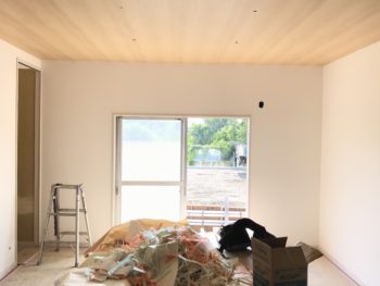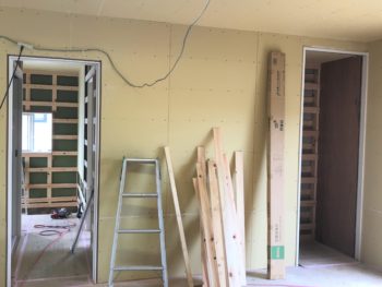 室内の壁ボードも施工が完了し、次はクロスを貼っていきます。