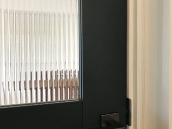 LDKの建具にはLIXIL『ヴィンティア』のボトルグリーン色を採用。モールガラスがオシャレで空間のアクセントになっています。