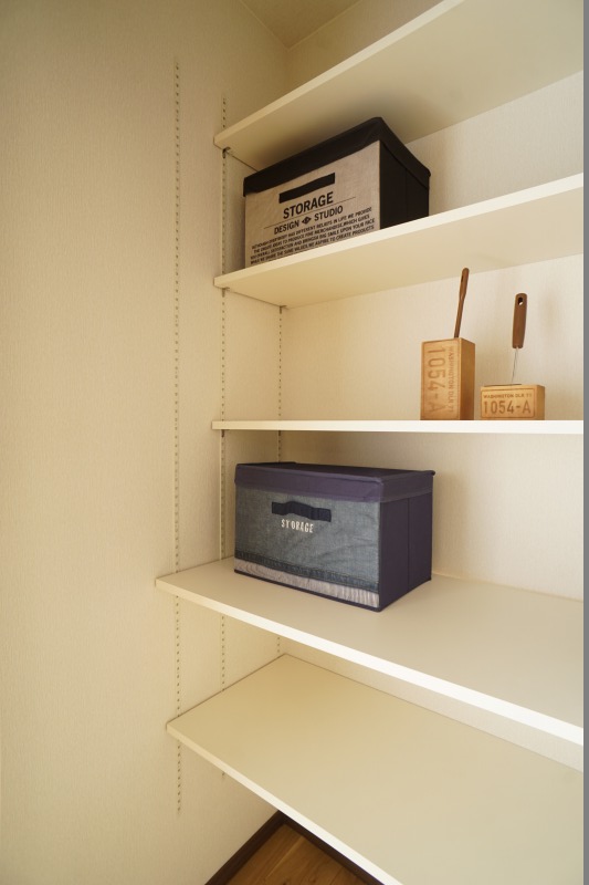 キッチンの横にはもう1つ収納スペースがあります。こちらはオープン可動棚になっているのでサッと取り出せて、サッと片付けることができます。