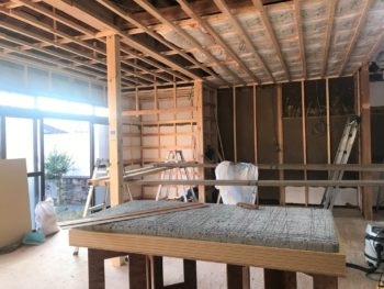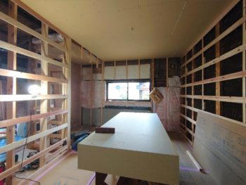 天井下地中。天井にもしっかり断熱材を入れていきます。