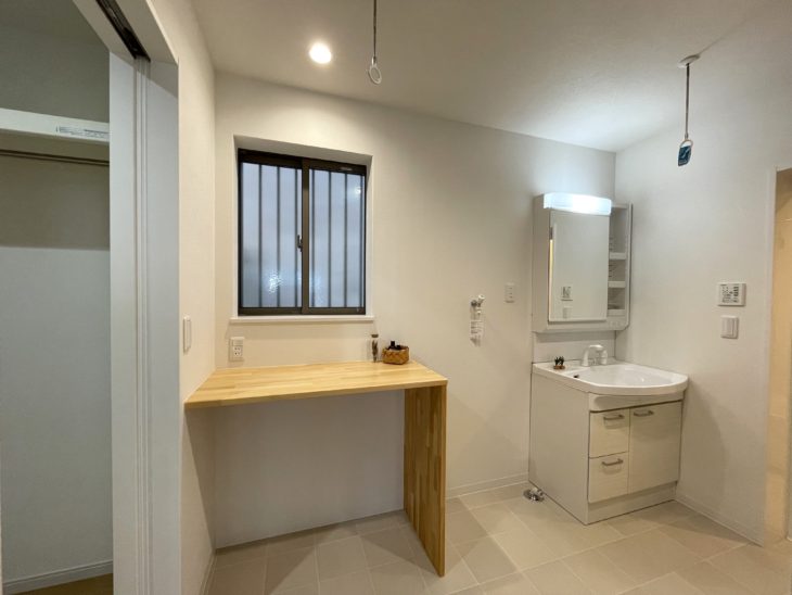洗面所には洗濯物を畳んだり、アイロン掛けができるカウンターを造作。カウンター下には収納ケースが入れられる高さをとっています