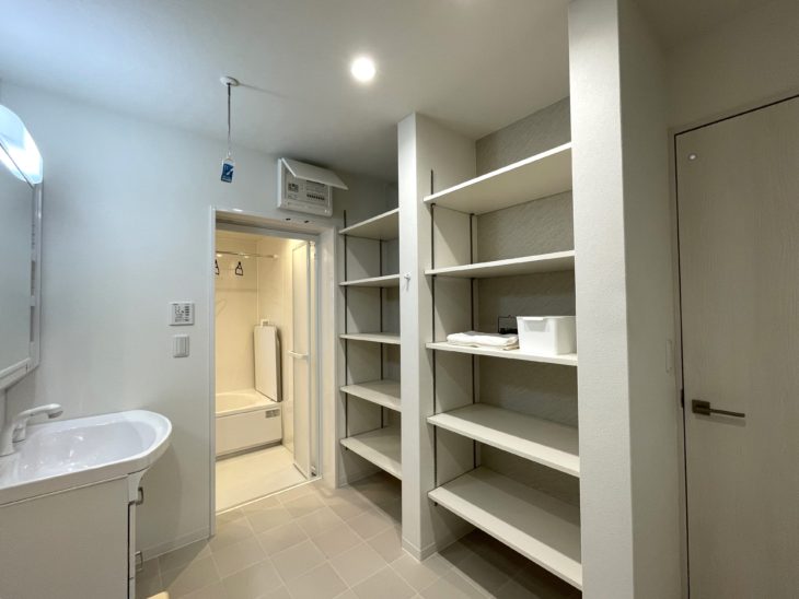 洗面所には大容量の可動棚を造作。タオルだけではなく、洗面所周りのストック品や着替えを置くことも可能です