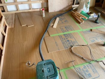 フローリング施工中。キッチン廻り用のコンセントは床から配線しています