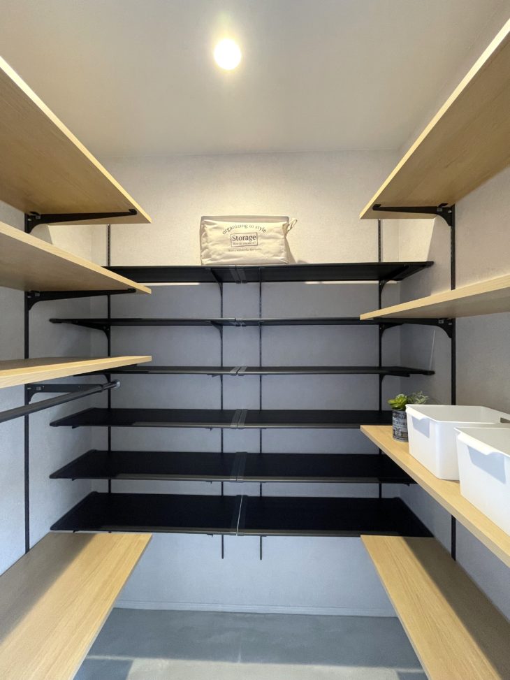 シューズクロークはコの字型の棚で、靴以外の物も十分収納できます