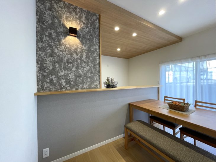 キッチンは下がり天井にしました。キッチンカウンターも端まで伸ばして、ブラケットライト取付、物を飾れるスペースにしました。