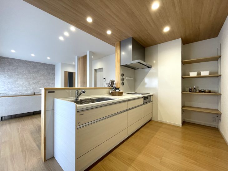 キッチンには可動棚も造作し、収納量もたくさんあります