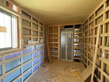 システムバスを組付け、洗面所周りも壁下地を造作していきます