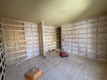 天井が完成し、壁下地造作中。断熱材も入れていきます