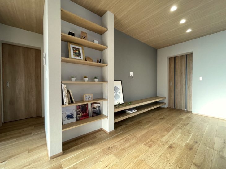 TVカウンターと可動棚を造作。よりスッキリとした印象を与えます