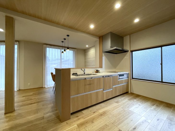 突板のナラ樫フローリングと、天井木目クロス。全体的に温かい印象になるように、ベースのクロスもアイボリー系を選びました