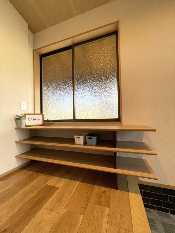 窓下には日常使いの靴や、小物を片付けられるオープン棚を造作