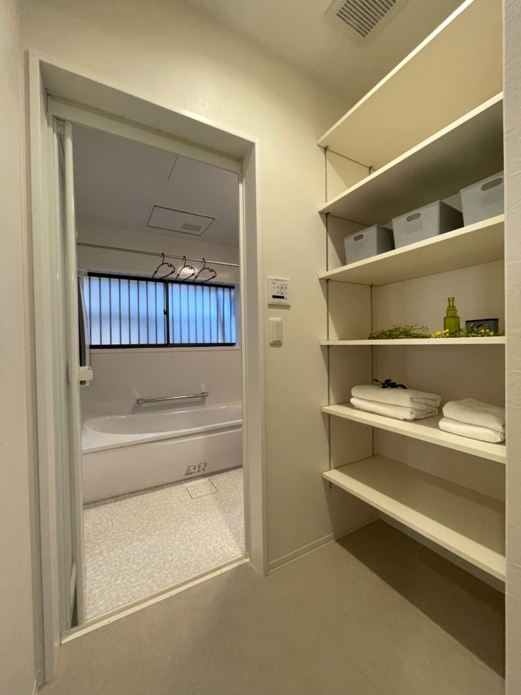 1坪のお風呂を入れたので元々の洗面所よりは狭くなりましたが、脱衣するには十分なスペースです。タオルだけではなく着替えも置いておくことができます
