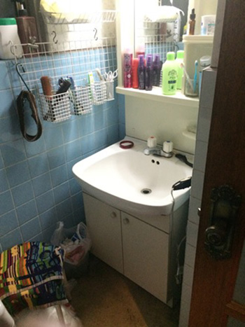 狭く、物が溢れて片付かない洗面所。