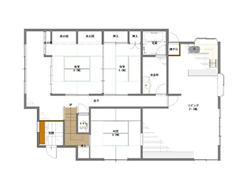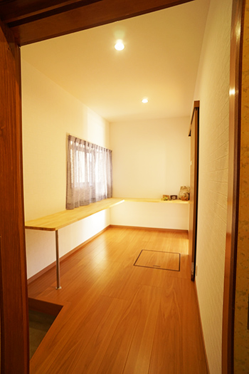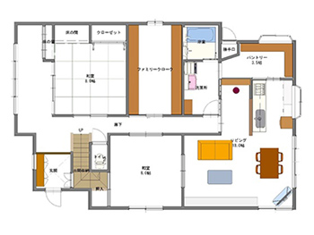 ・広すぎたLDKは3.5畳の大きなパントリー+LDKに。 ・勝手口ドアを交換することができなかったので、古い勝手口が 新しくなったLDKから見えないようにパントリーを作る。 ・6畳+押入の7.5畳の和室は大容量のファミリークロークに。 ・玄関横に土間収納をつくる。 |