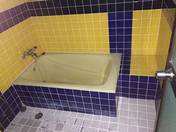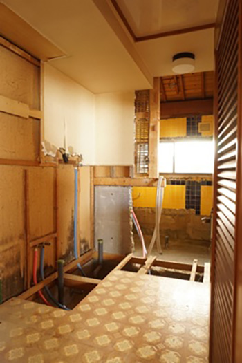 既存のお風呂が解体され、洗面台の給排水工事が完了しています。