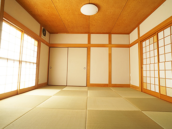 LDK横の和室はオレンジの入った障子デザイン、こちらの和室はグリーンの入った障子デザイン。元々のグリーンの壁を塗り替えることで明るい印象になりました。