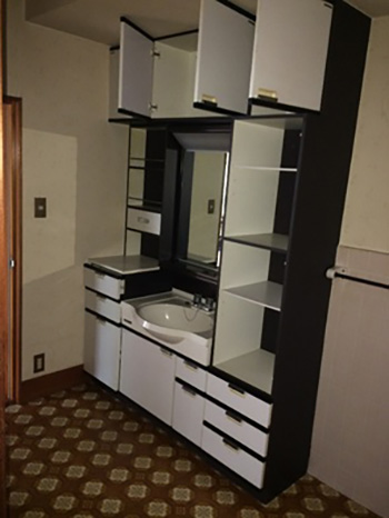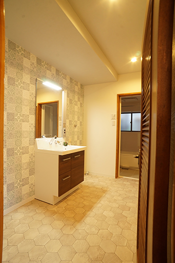洗面台、内装を一新。洗面台の右隣に洗濯機、左隣に収納を置くことができます。