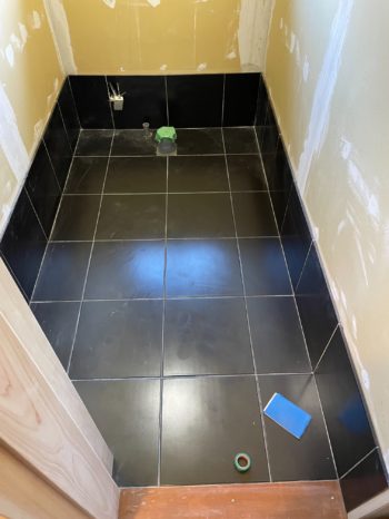 床は安っぽくならないようにクッションフロアではなくタイルを選びました。清掃性がいいようにサラサラの触り心地のタイルを選びました。