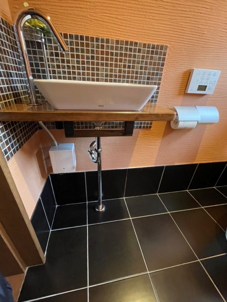 落ち着き・温かみのあるトイレ空間に生まれ変わりました。まるで和食のお店のようです。